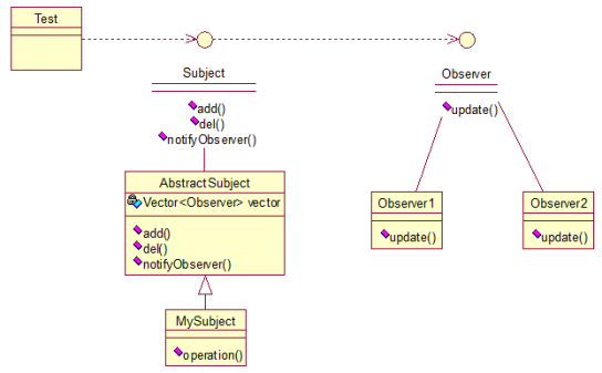 public class ObserverTest { public static void main(String[] args) { Subject sub = new MySubject(); sub.add(new Observer1()); sub.add(new Observer2()); sub.operation(); } } |